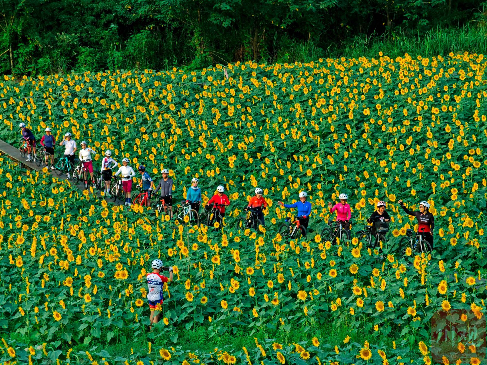 8月25日,温江寿安汪家湾花海,自行车爱好者在花海里骑行留影。 文增勇 摄
