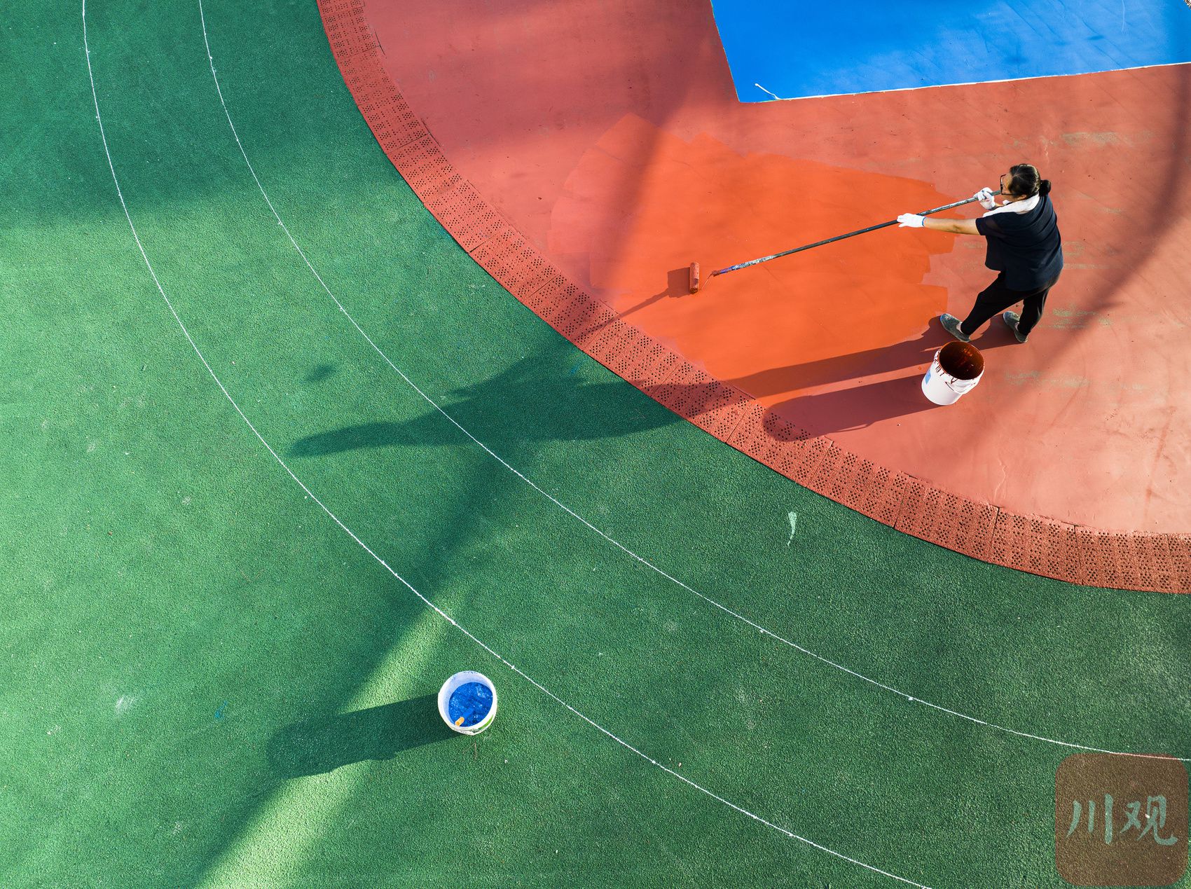 8月25日,南充阆中市城西小学运动场改造现场,工人在烈日高温下涂专用漆,确保新学期如期开学。 梁德 摄