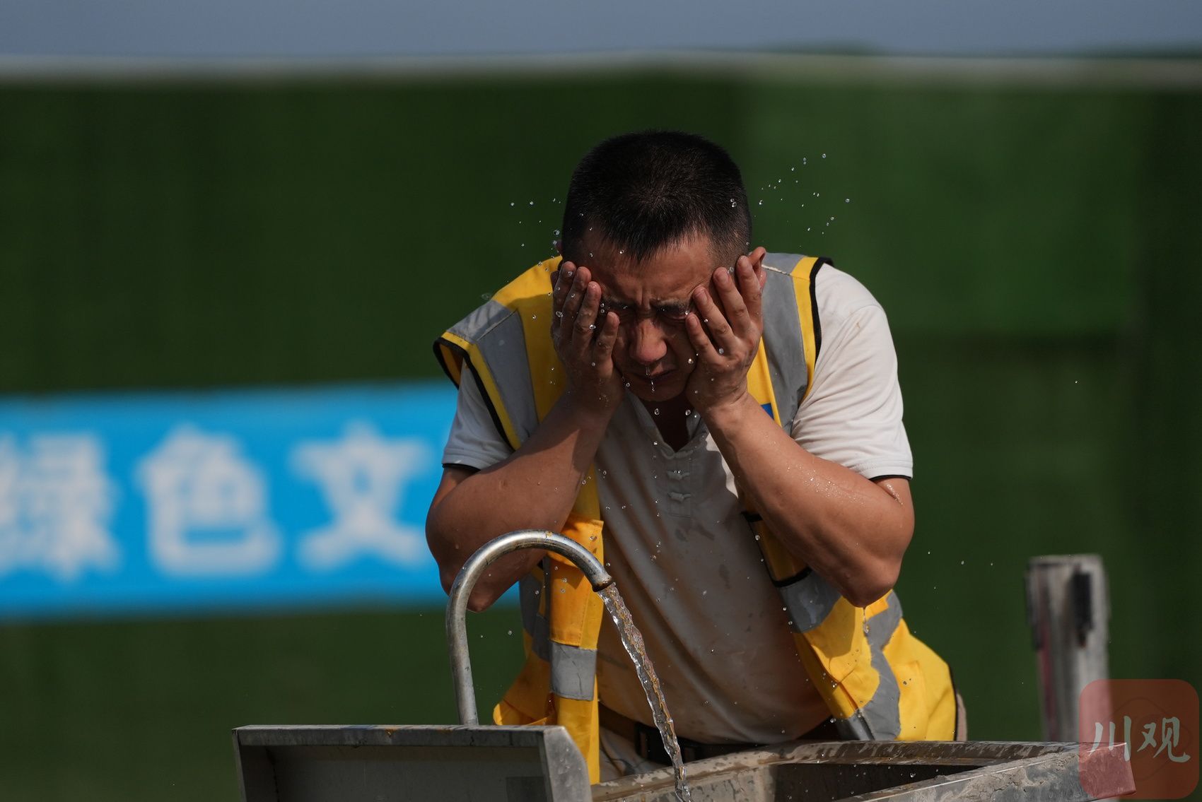 8月25日,眉山市眉山天府新区人民医院建设工地上,建筑工人冲凉洗脸。 张忠苹 摄