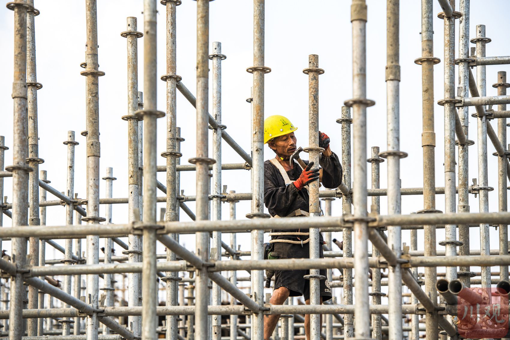 8月25日晨,成都高温破38℃。为了工人健康,建筑企业调整工时,在早晚凉爽时作业。 祝旭 摄