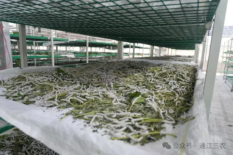 走进四川省巴中市通江县春在镇的大蚕工厂化生态养殖擂鼓寨基地,一排排整齐有序的蚕架子映入眼帘。蚕网上,一只只蚕宝宝陆续开始吐丝,只见颗颗蚕茧形状饱满,雪白如霜,工人们认真地挑选、消毒、铺设蚕网,充分保障蚕茧的品质。