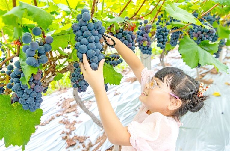 船山区河沙镇凤凰村葡萄成熟,市民带着孩子前往体验采摘乐趣。 全媒体记者 吴奉家 摄