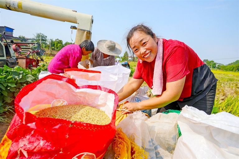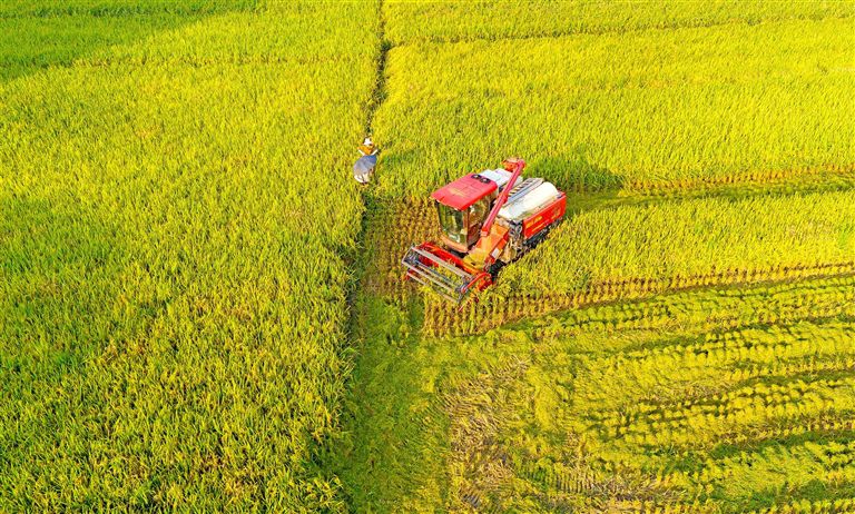 当前,广袤的遂宁乡村正沉浸在丰收的喜悦中。民以食为天,食以粮为先。连片的稻谷长势喜人,微风拂过,泛起阵阵涟漪,稻香扑鼻而来,沁人心脾。通过高标准农田建设、宜机化改造的农田,更加适合机械耕种、收割,农机人员驾驶着收割机在田地里来回穿梭,所到之处金灿灿的稻谷流入粮斗,一茬茬颗粒饱满的稻穗被收入囊中,让村民的“米袋子”更加充盈。