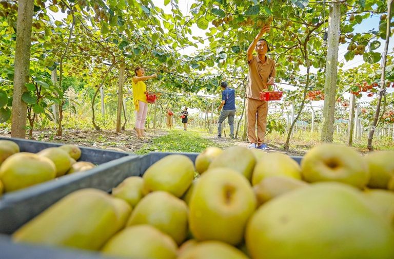“晒丰收”,我们的“果盘子”同样丰富。七八月以来,连片种植的葡萄熟了,猕猴桃也挂满了枝头。果农们一大早就来到基地采摘,批发商的拉货车已在田边等待,游客们也穿梭其间享受采摘乐趣。