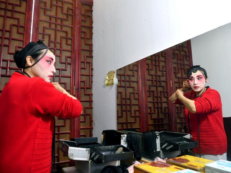 任凤琼在后台身穿红色戏服,在脸上抹完油彩化完妆,又忙着捆头了。第二场折子戏《北楼戏娇》她主唱旦角,“闭着眼睛演,也能倒背如流!”谈起唱戏,任凤琼的眉眼带笑,难掩自得。自1981年高中毕业那年,任凤琼在村口晒坝场看戏,便一眼爱上了川剧。18岁的她不顾当中学教师的父亲阻拦,执着地跟戏班学戏,穿上戏服后就再没脱下。
