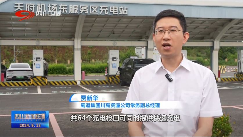 蜀道集团川高资潼公司常务副总经理 贾新华:主线三对服务区均设置充电桩,共64个充电枪口可同时提供快速充电,在乐至南服务区,还设置有省内第一家蔚来汽车换电站,新能源赋能绿色出行,打造“绿色低碳电走廊”。