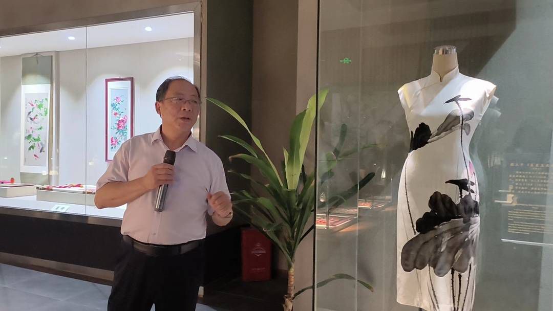 四川顺成纺织品有限公司总经理王尚学介绍蜀绘发展。(摄影:谢杰)