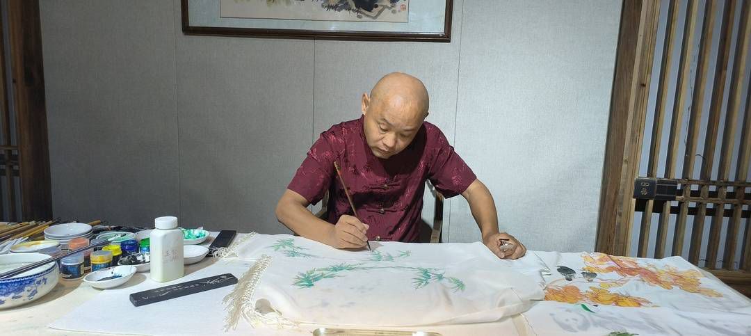 长条画案上,细腻丝绸泛着独有的光芒,非遗传承人一笔笔勾勒,绘制出一件件极具巴蜀特色的丝绸绘画作品。