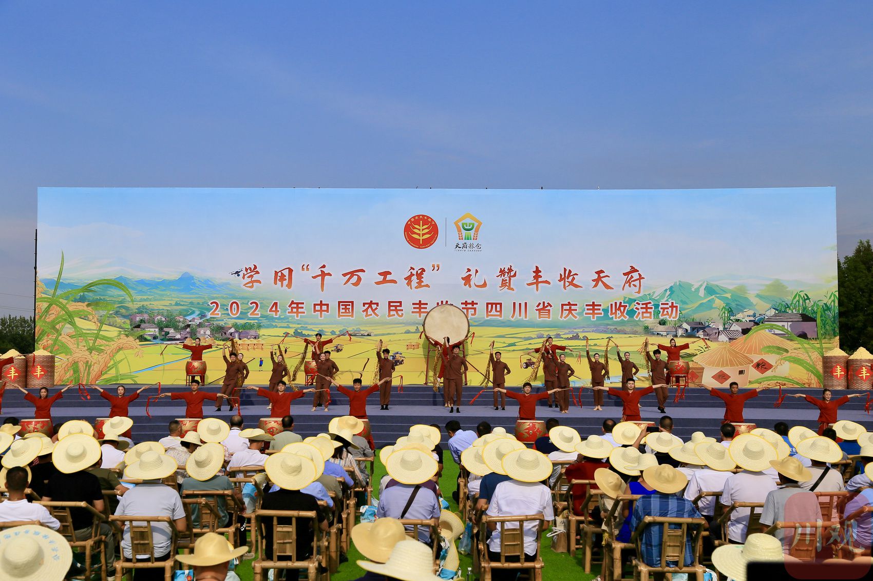 “1”即1场群众庆祝丰收联欢活动。活动围绕“学用‘千万工程’ 礼赞丰收天府”主题,通过《丰收天府》《丰收锣鼓大联欢》《农民赛歌会》《天府“星村”》等互动式、情景式的团体表演,全面展示四川农业发展新成就、农村改革新气象、农民群众新风貌。