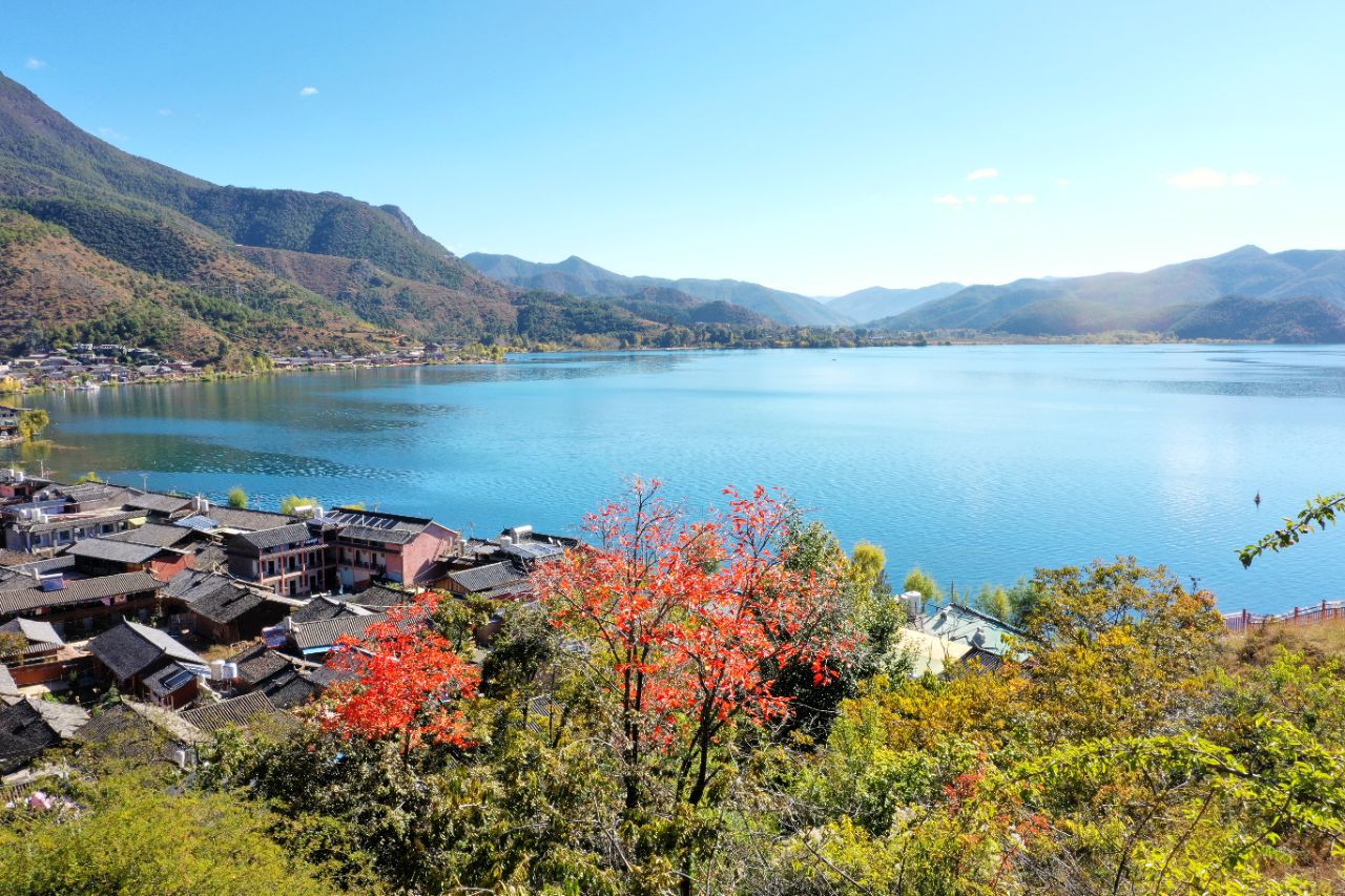 秋天,还会让披裹在山峦上的外衣焕然一新。在五彩斑斓的点缀中,远山开始变换颜色,从翠绿到金黄,最后橙红。丰富的色彩让山林显得亲切和热烈,与人间烟火隔绝的泸沽湖开始变得“平易近人”,层峦叠嶂的山脉与湖水交织,壮丽画卷跃然眼前。