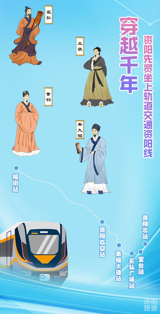 在历史的长河中,资阳以其独有的文化底蕴,孕育了孔子之师苌弘、文坛巨匠王褒、五官中郎将董钧、数学泰斗秦九韶等无数先贤。今日,四川省首条跨市域轨道交通线路——轨道交通资阳线正式开通,先贤们穿越来到了列车上。当古老智慧遇上现代科技,接下来会发生怎样的故事?点击画卷,开启奇妙之旅。