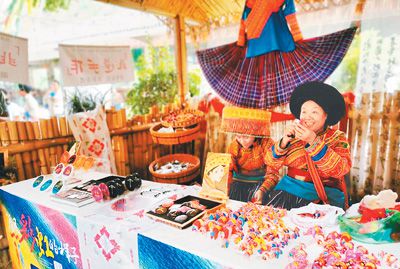 傈僳族妇女在传习中心内制作各种手工制品。王 磊摄