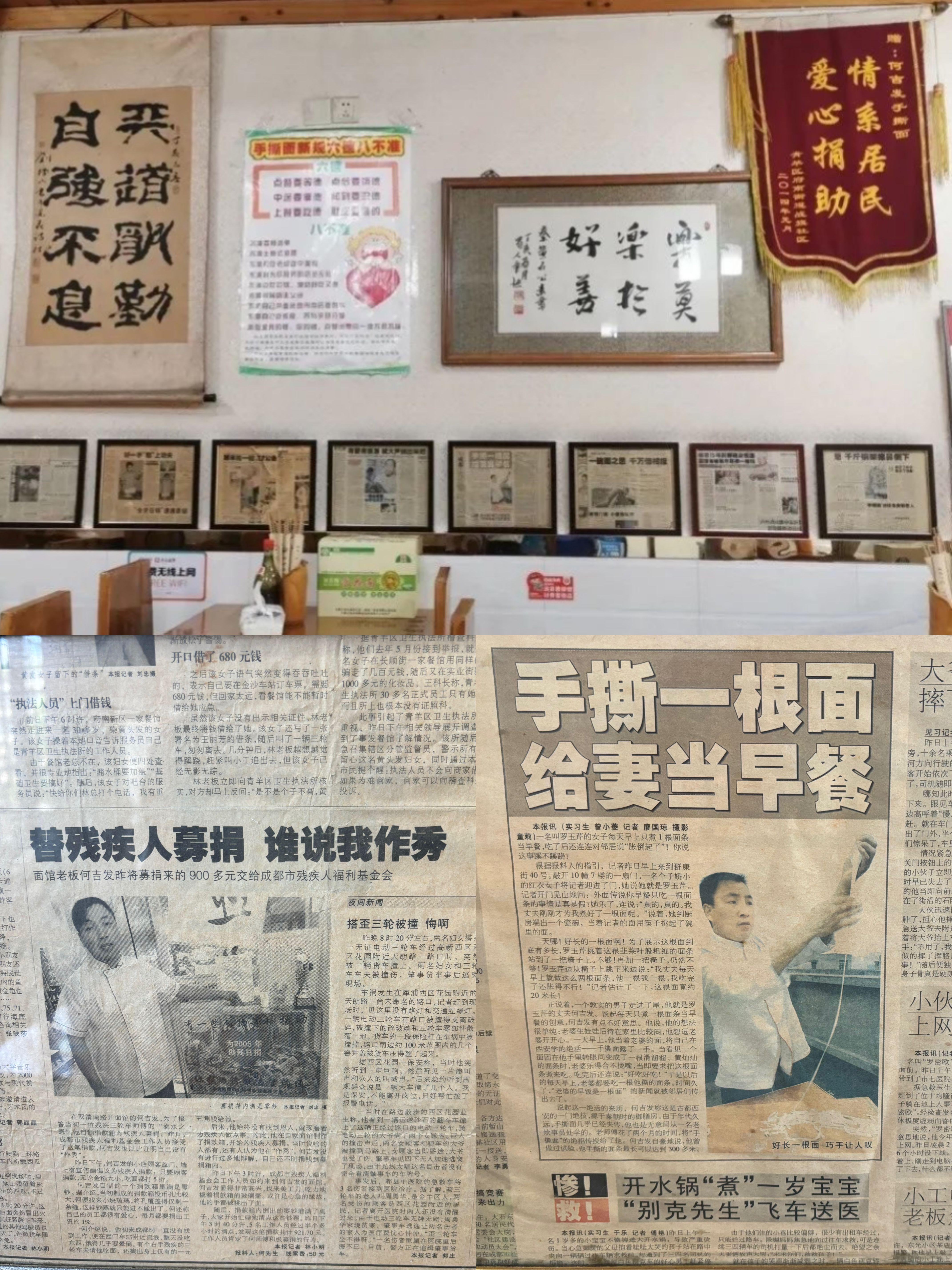 如今,何吉发的手撕面店已经做了23年的公益事业,帮助过的困难人士上万名。他的故事被众多媒体报道,小店的墙上贴满了这些年来的剪报和锦旗。