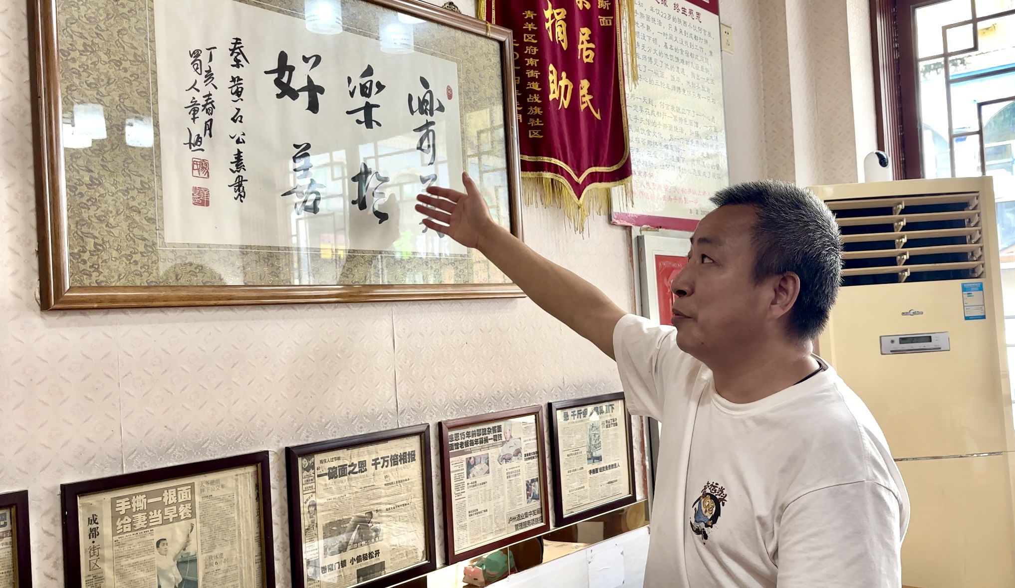 何吉发手撕面店墙上贴满了剪报和锦旗
