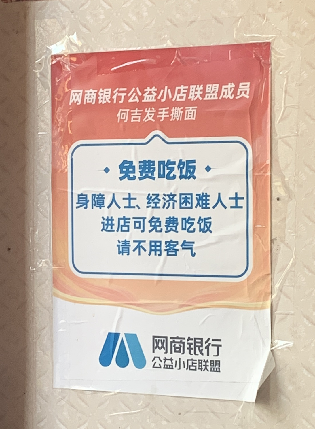 走进位于成都市青羊区双清南路的“何吉发手撕面”面馆,进门便可见一副醒目的字画:“乐莫乐于好善”,旁边的墙上贴着一张海报,清楚地写着:“身障人士、经济困难人士免费就餐”。