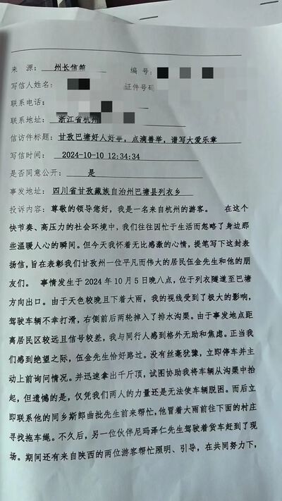 近日,“州长信箱”里收到了一封特殊的“来信”。在信里,一名来自杭州的游客,用朴素平实的语言,深情地讲述了发生在巴塘的一段感人故事,字里行间,不仅流露出对这段经历的深刻感受,更传递出人与人之间温暖而真挚的情感。10月12日,记者拨通了游客杜先生的电话,这封感谢信背后的故事终于揭晓。