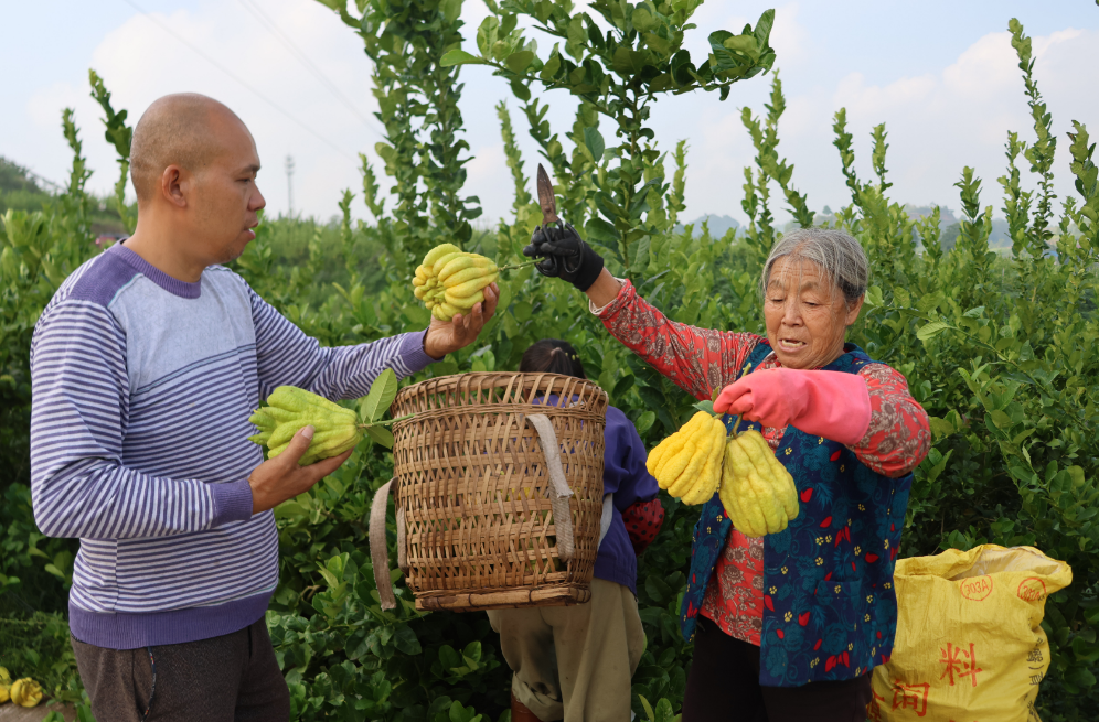 10月14日9时许,在遂宁市蓬溪县蓬南镇川馥佛手产业园内,一颗颗佛手果挂满枝头,果实形态各异,或伸长如“指”,或紧握似“拳”,空气中弥漫着阵阵清香,50余名果农正在采摘、装框、分拣、搬运。