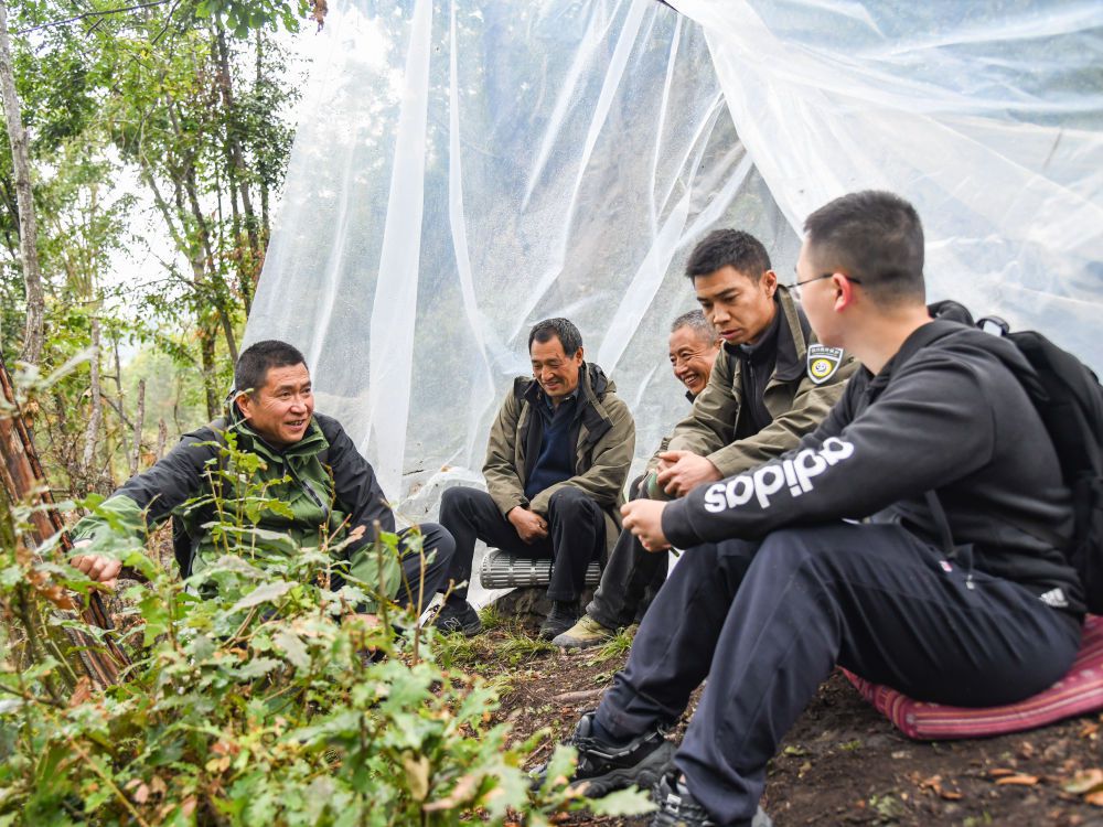 在四川白河国家级自然保护区,唐玉林(左一)和巡护队员一起在搭建的简易塑料蓬内短暂休息交流(10月11日摄)。