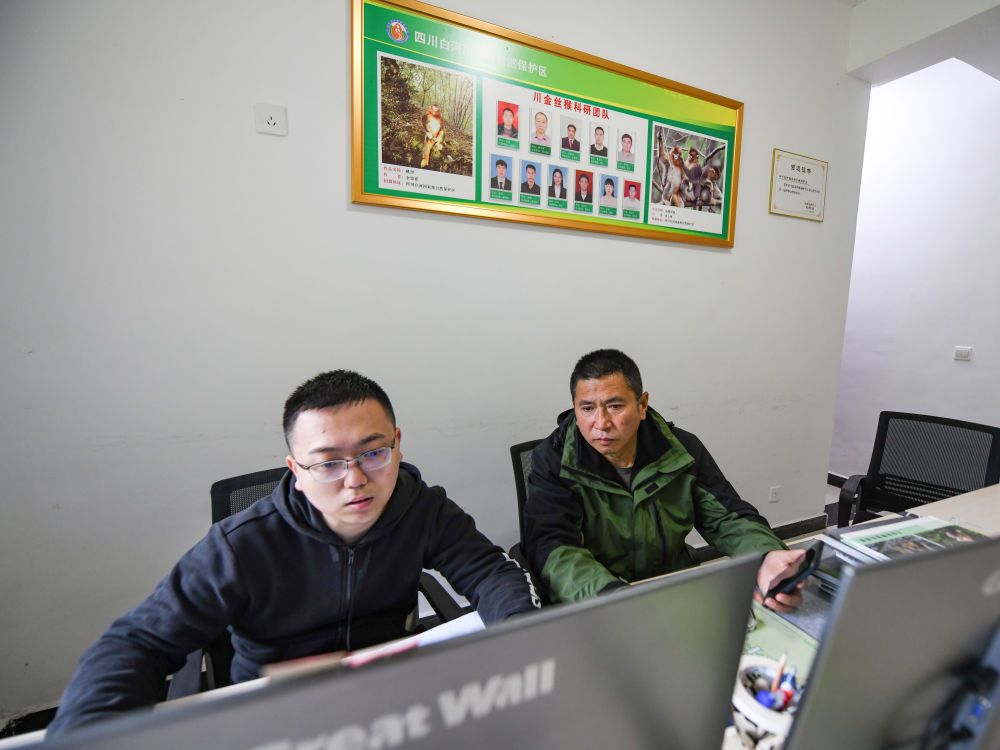 在四川白河国家级自然保护区,唐玉林和西华师范大学生物学研究生刘昕在办公室将巡护记录的资料录入电脑系统(10月11日摄)。