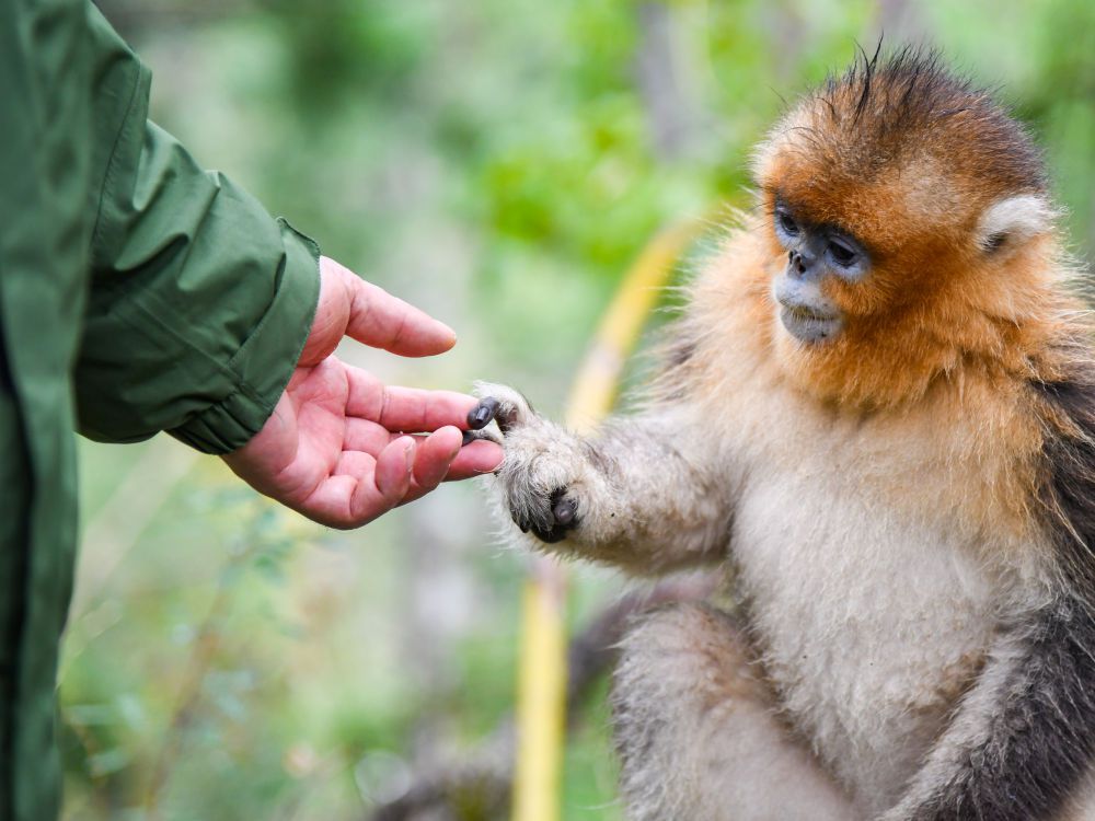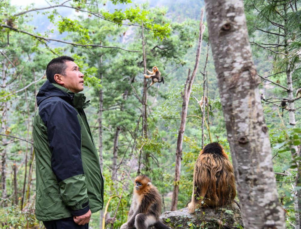 在四川白河国家级自然保护区,唐玉林与川金丝猴互动(10月11日摄)。新华社记者 王曦 摄
