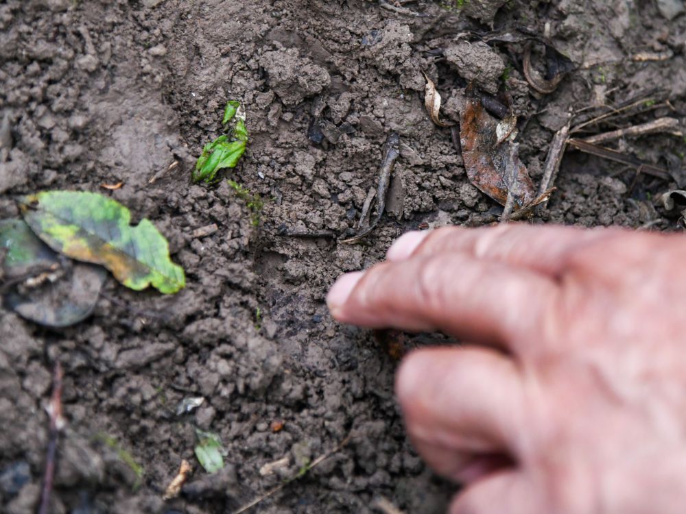在四川白河国家级自然保护区,唐玉林在巡护路上发现毛冠鹿的脚印(10月11日摄)。