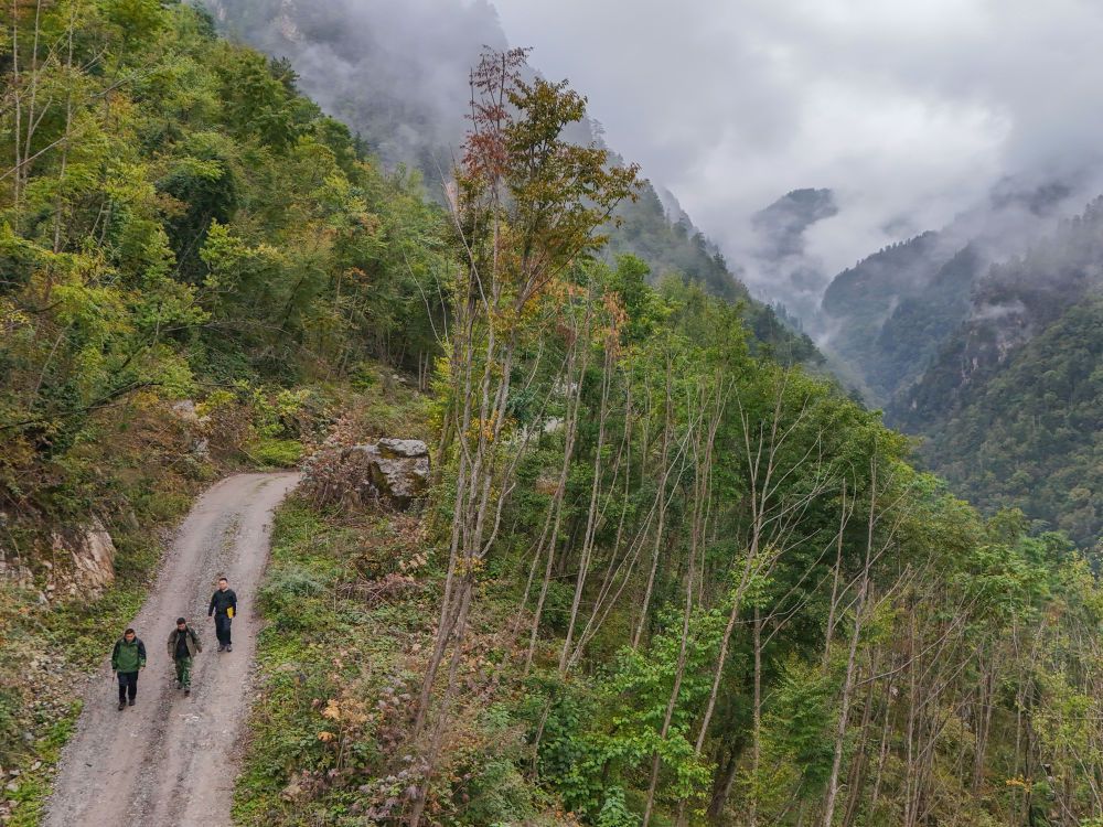 在四川白河国家级自然保护区,唐玉林(左)、侄子唐小刚(中)和西华师范大学生物学研究生刘昕走在巡护的路上(10月11日摄)。