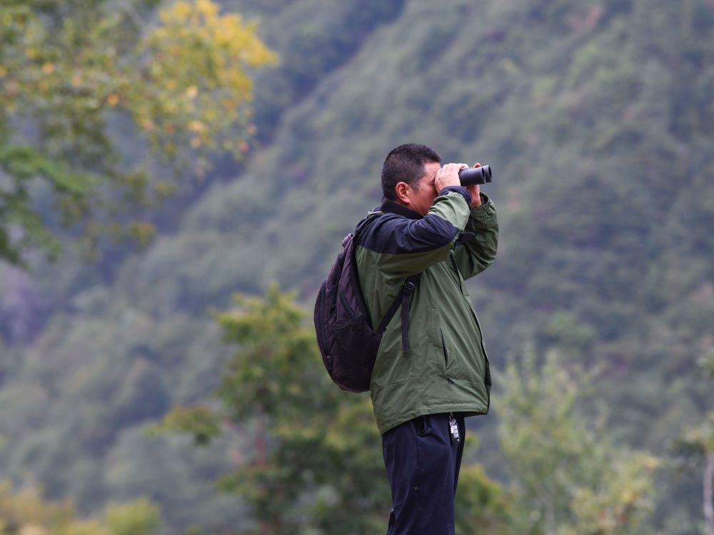 在四川白河国家级自然保护区,唐玉林使用望远镜观察保护区森林防火情况(10月11日摄)。