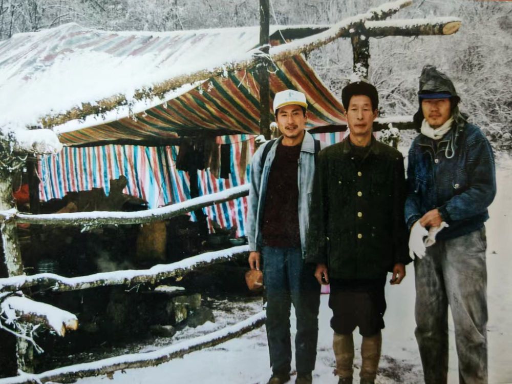 这是1996年唐玉林(左)、父亲唐代贵(中)和保护区科研人员顾海军在四川白河国家级自然保护区内的合影(翻拍照片)。