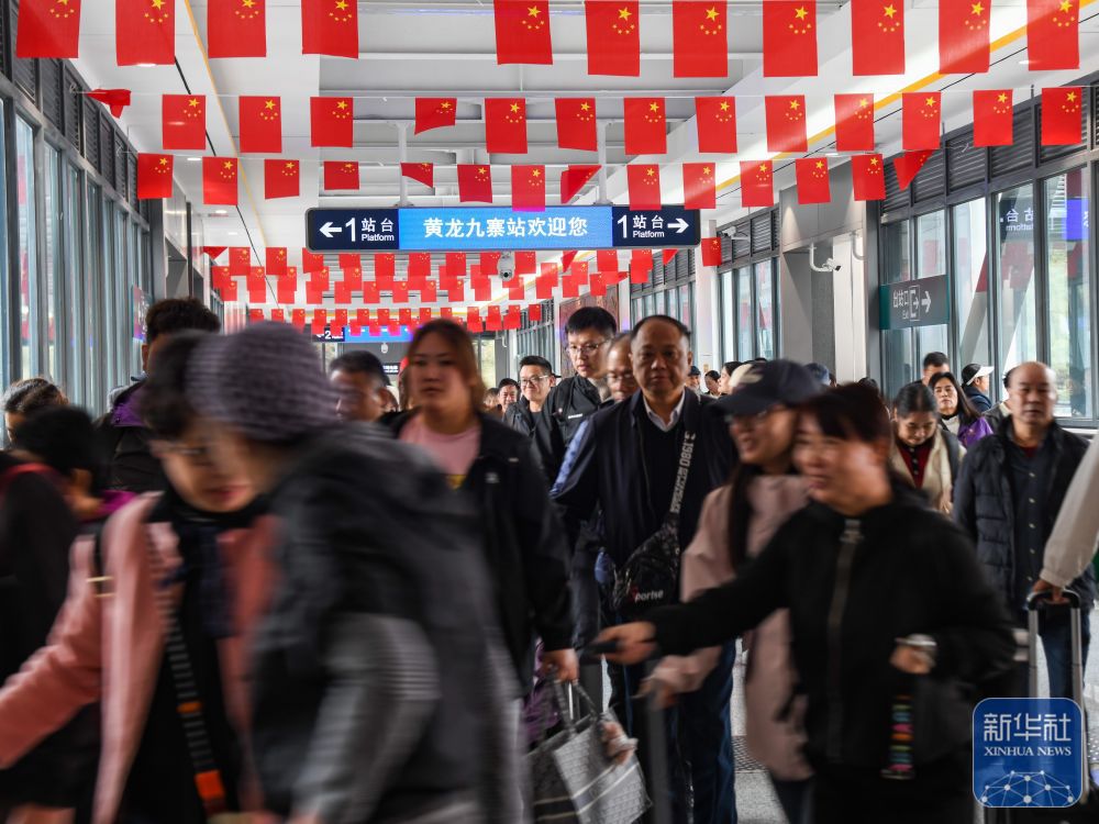 ↑10月9日,游客到达川青铁路黄龙九寨站。