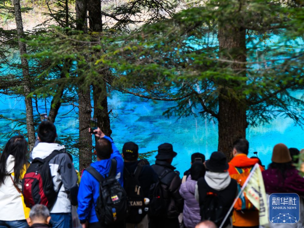 ↑10月10日,游客在九寨沟景区五彩池观光游览。