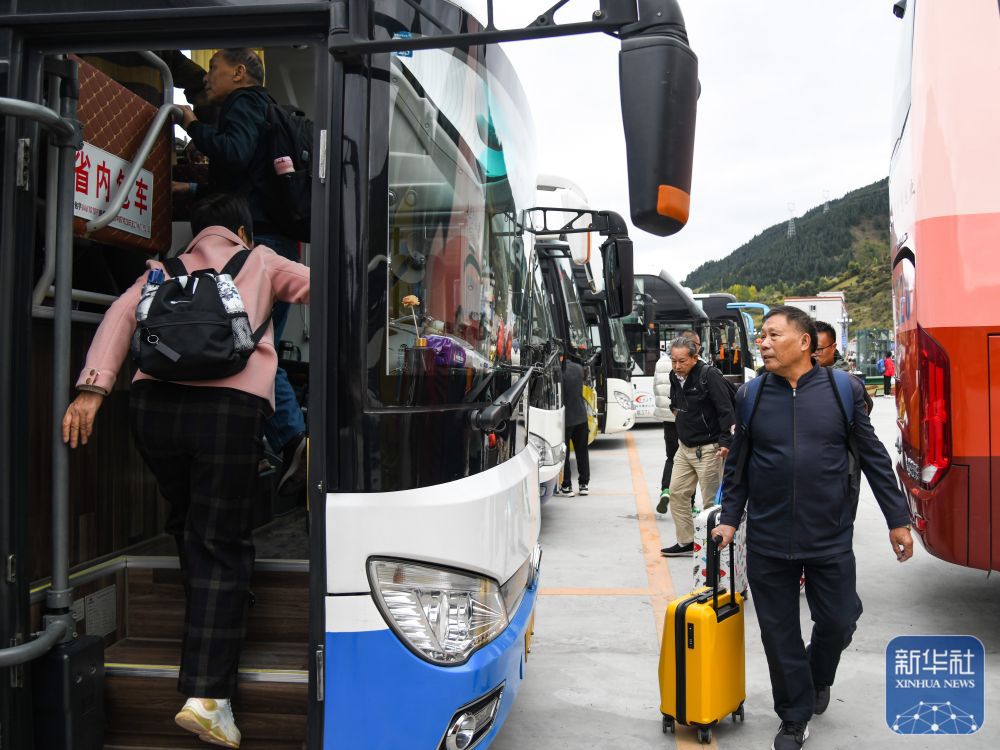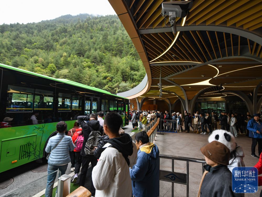↑10月9日,游客在黄龙九寨站外乘坐通往景区的接驳车。