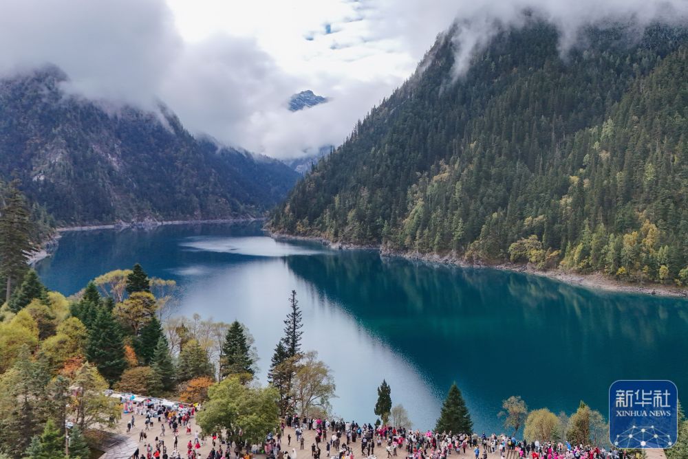 ↑10月10日,游客在九寨沟景区长海游览观光(无人机照片)。