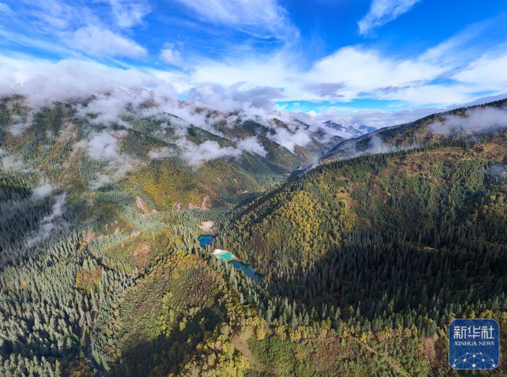 ↑这是10月12日拍摄的九寨沟县神仙池景区内的高原湖泊和钙化池(无人机照片)。