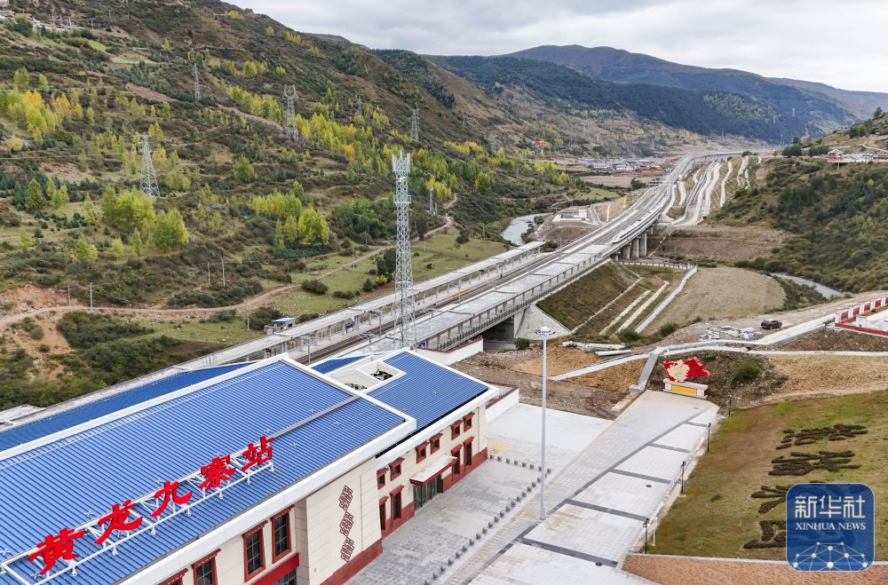 ↑10月9日,一列动车驶入川青铁路黄龙九寨站(无人机照片)。