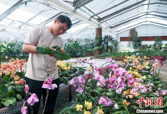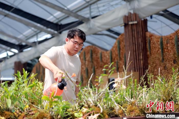 近日,詹皓淳在花草大棚中查看兰花生长情况。中新社记者 王磊 摄