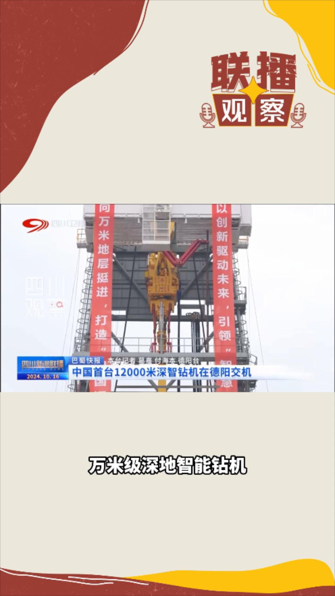 各位看官看过来——10月16日的《四川新闻联播》关注了四川造的万米级深地智能钻机完成验收并交付的新闻。