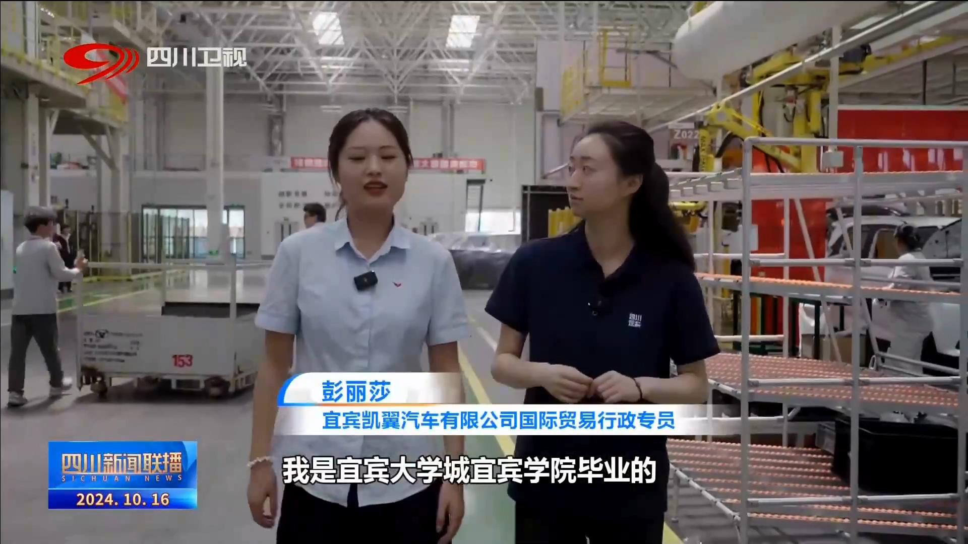 宜宾凯翼汽车有限公司国际贸易行政专员 彭丽莎:我是宜宾大学城宜宾学院毕业的,入职已经两年了。(公司)去年出口的汽车已经达到了3.5万辆,足迹已经遍布了30多个国家和地区。去年我就介绍了两个师弟师妹他们过来,现在也是发展得还不错。