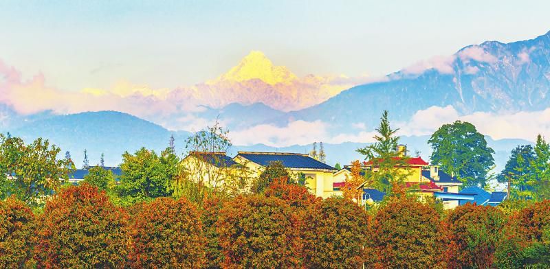 10月17日清晨,入秋后的第一个“日照雪山”出现。在成都市温江区寿安镇汪家湾社区,桂花飘香,与四姑娘山同框的景色美轮美奂。 韦洪涛 摄(C视觉)