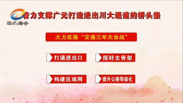 着力支撑广元打造进出川大通道的桥头堡。必须大力实施“交通三年大会战”,在打通进出口、搭好主骨架、构建区域网、提升公路等级化上下功夫,加快构建内畅外联、通江达海的现代化立体交通运输体系。公路方面,积极谋划兰海高速昭化镇、柏林沟镇出口前期工作,加快推进G5京昆高速扩容红岩段建设,实现与广巴(达、万)、兰渝、G5京昆(新、老线)高速互联互通,积极构建区域路网,争创全国“四好农村公路”示范县(区)。铁路方面,协助做好广巴铁路扩能改造工程建设,积极谋划广元港专用铁路、柳桥分水岭火车客(货)运站、兰渝铁路太公火车站建设前期工作,实现铁路大连接。水运方面,加快建设射箭水东坝航电枢纽和虎跳水上应急救援基地。