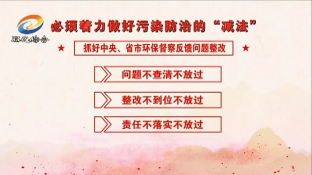 必须着力做好污染防治的“减法”,紧盯重点区域、重点领域,全力打好污染防治“八大战役”,突出抓好中央、省市环保督察反馈问题整改,切实做到问题不查清不放过、整改不到位不放过、责任不落实不放过、群众不满意不放过;