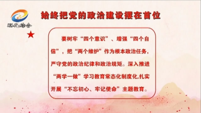 始终把党的政治建设摆在首位。要树牢“四个意识”、增强“四个自信”,把“两个维护”作为根本政治任务,严守党的政治纪律和政治规矩。深入推进“两学一做”学习教育常态化制度化,扎实开展“不忘初心、牢记使命”主题教育。