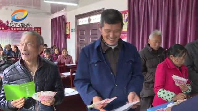 在晒金村村委会会议室,村主任贾正和与其他工作人员一边核对贫困户的社员股金证,一边发放分红资金。领到分红资金的贫困户,心里是乐开了花。