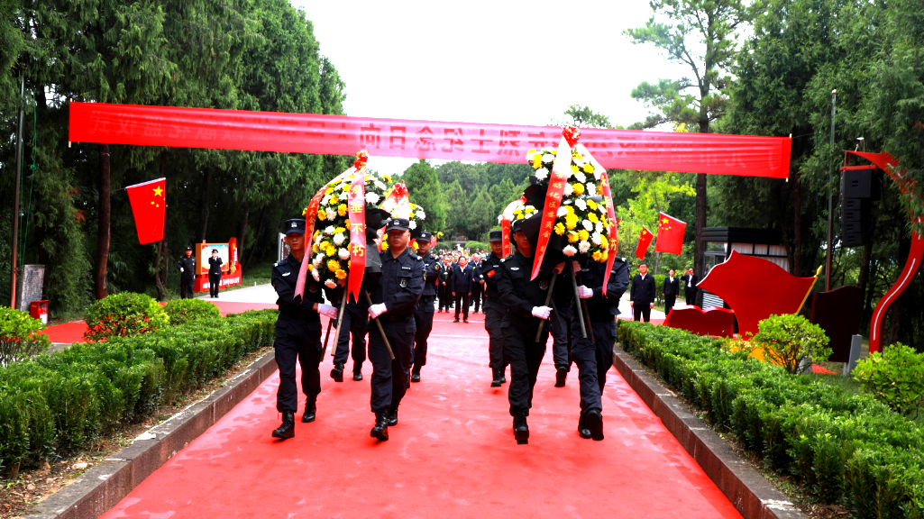 方阵前,4个花篮呈一字排开,花篮红色缎带上书写的“烈士永垂不朽”字样格外醒目。
