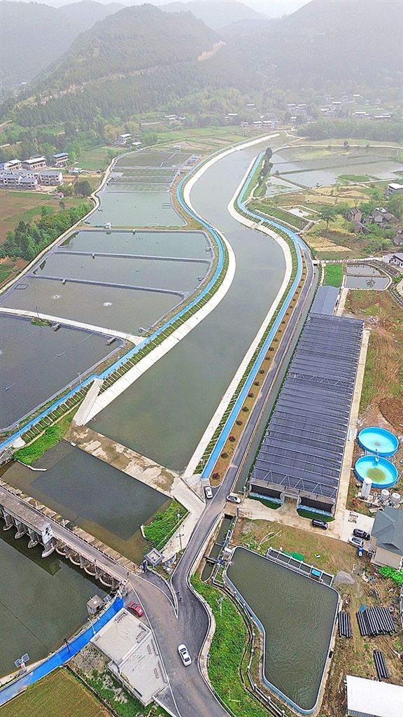 5月的射洪市香山镇苏家堰村,桃花河波光粼粼,连片鱼塘泛起细碎银光。
