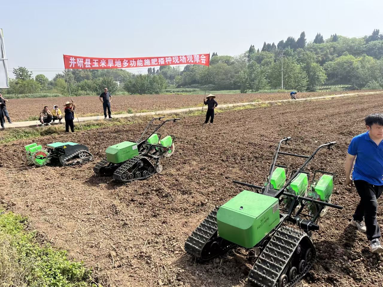 在井研县王村镇研池专业合作社的田间,一场玉米机械化播种技术现场会引人注目。由乐山市农科院联合省农机研究院推广的“电代油”履带式玉米播种机,以零碳排放、远程操控等优势,实现了丘陵山区4-7亩/小时的高效作业。配套的“乐创7979”玉米新品种更成为“明星产品”,该品种抗倒伏、宜机收,去年亩产达708.86公斤。