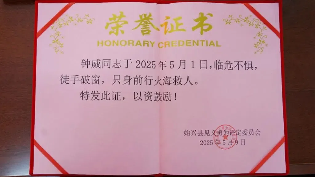 5月12日,钟威被授予“见义勇为”荣誉称号 图据澎湃新闻