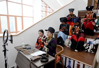 昭觉县沐恩邸社区彝绣工坊开通网络销售直播间,为绣娘增收开辟新途径。凉山州新闻传媒中心 钟源 摄