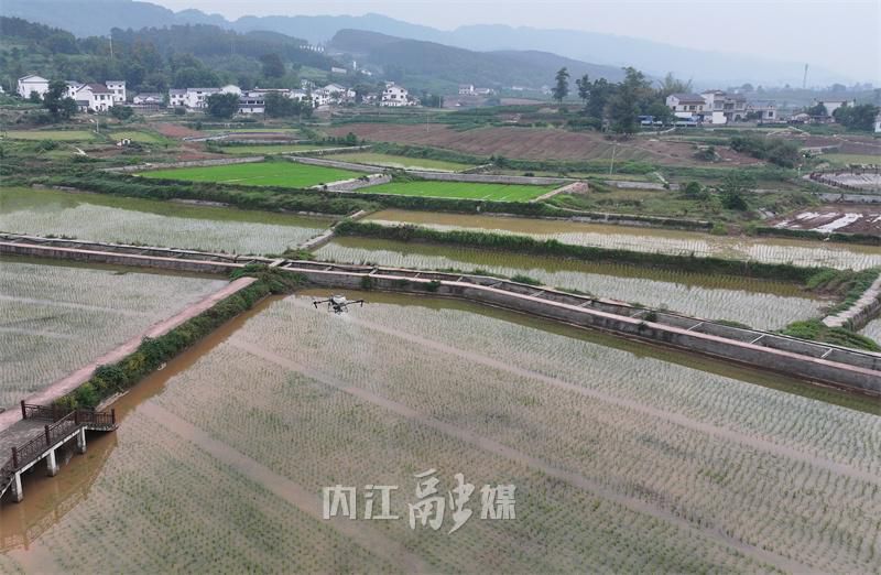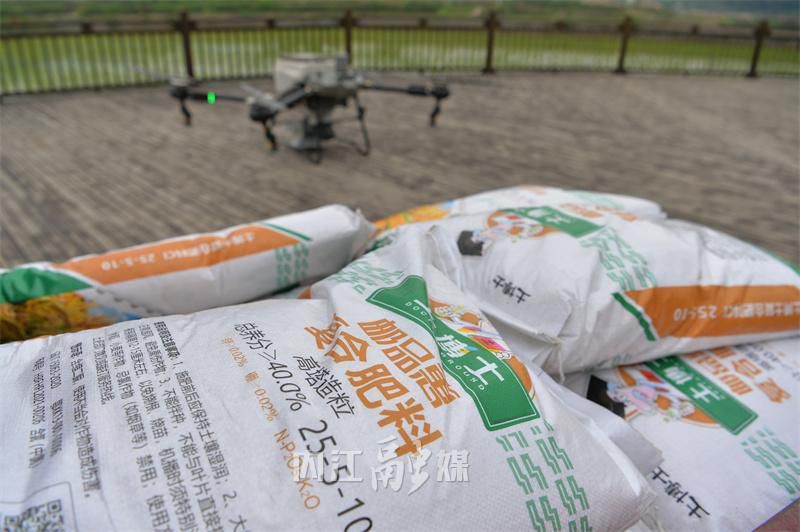 初夏时节,在三合村连片稻田上空,一架无人机正穿梭其中,洒下白色复合肥颗粒。