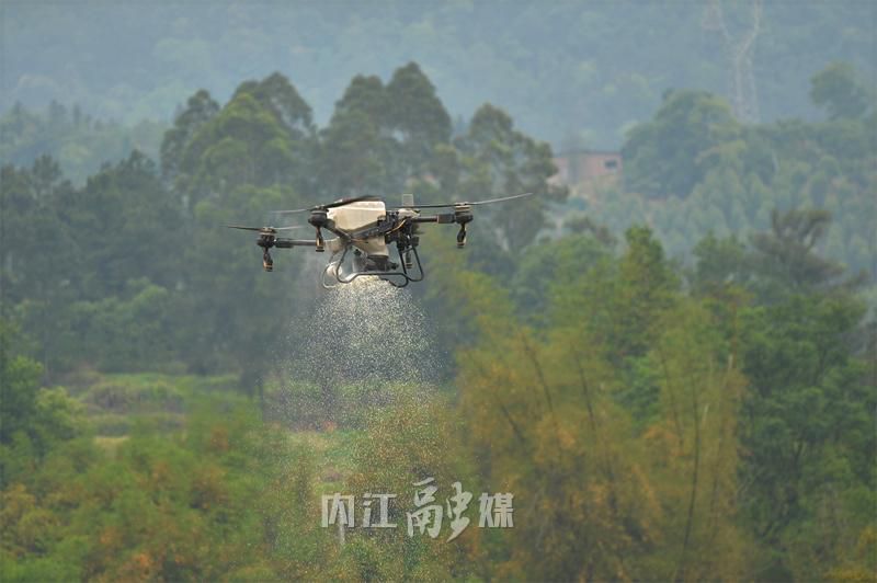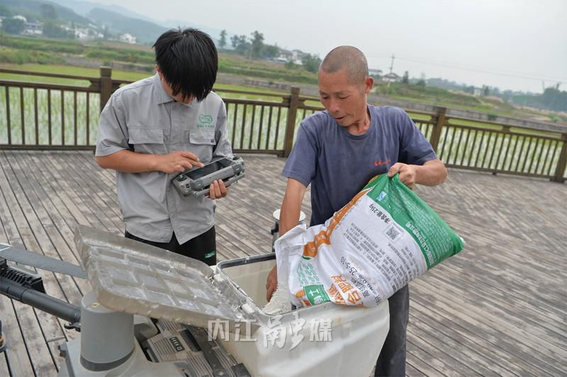 5月15日上午9点40分,隆昌市石燕桥镇三合村,“农业飞手”晏吕强娴熟地操控着遥控器,农用无人机在秧田上空划出规整航线,只见白色颗粒的复合肥沿着螺旋桨气流均匀沉降,洒向田间,为头天刚种上的秧苗提供养分。