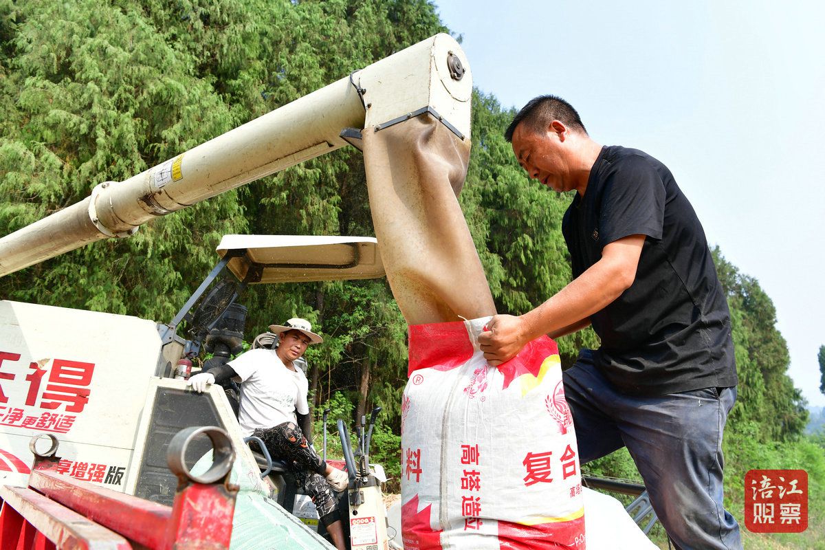 十几分钟后,显示屏提示机仓已满,黄海峰将收割机缓缓开下新垦的缓坡,停靠在一辆三轮车前,饱满的麦粒从卸粮管喷涌而出,种植大户张云赶紧用袋子接住麦粒。